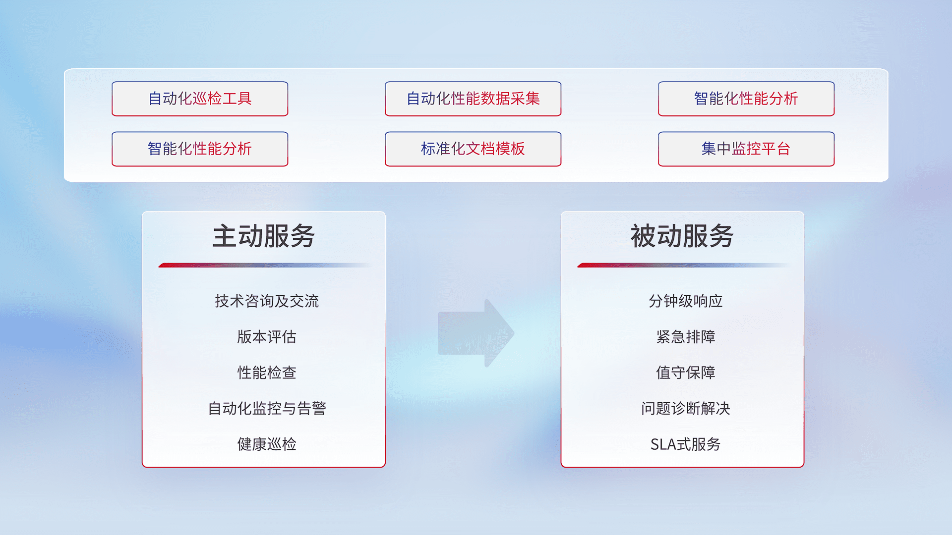 智能化工具和标准化文档,,,保障服务质量,,提供主动服务(包含技术咨询、、版本评估、、、、性能检查、、、、自动化监控与告警、、、健康巡检)和被动服务包含(分钟级响应、、、紧急排障、、值守保障、、、、问题诊断解决、、SLA服务)。。。